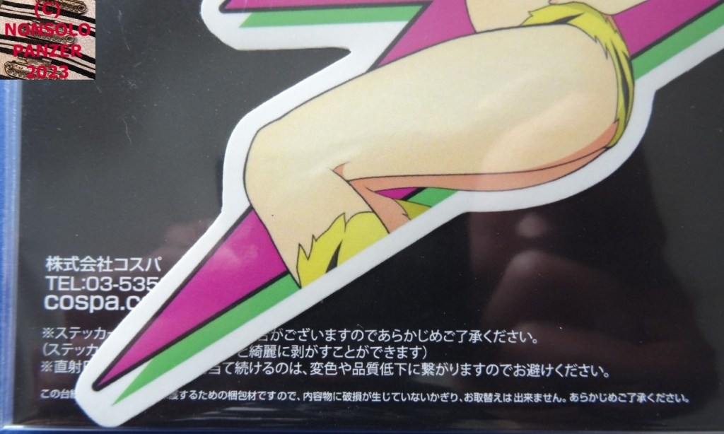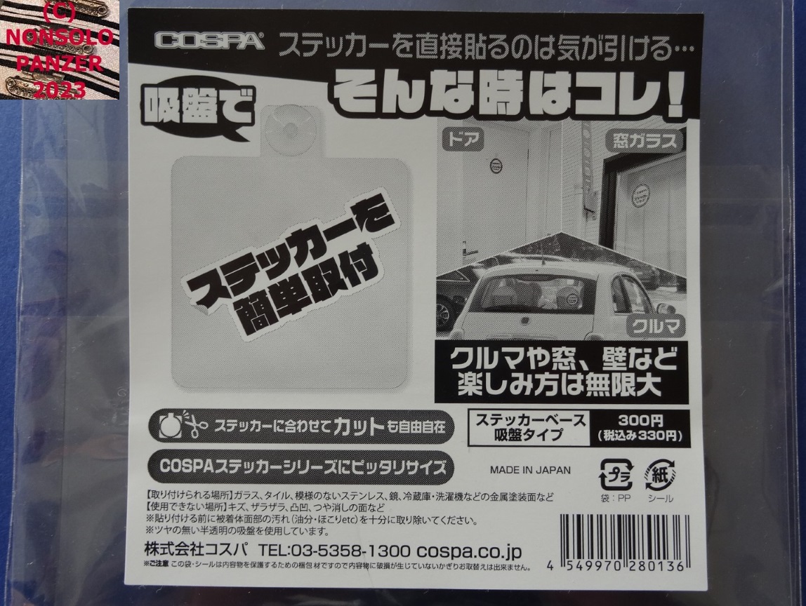 I bought the sticker together with the Sticker Base Suction Cup Type, a useful accessory that Cospa makes available to perfectionists like me who appreciate being able to display a sticker without attaching it to a specific surface.