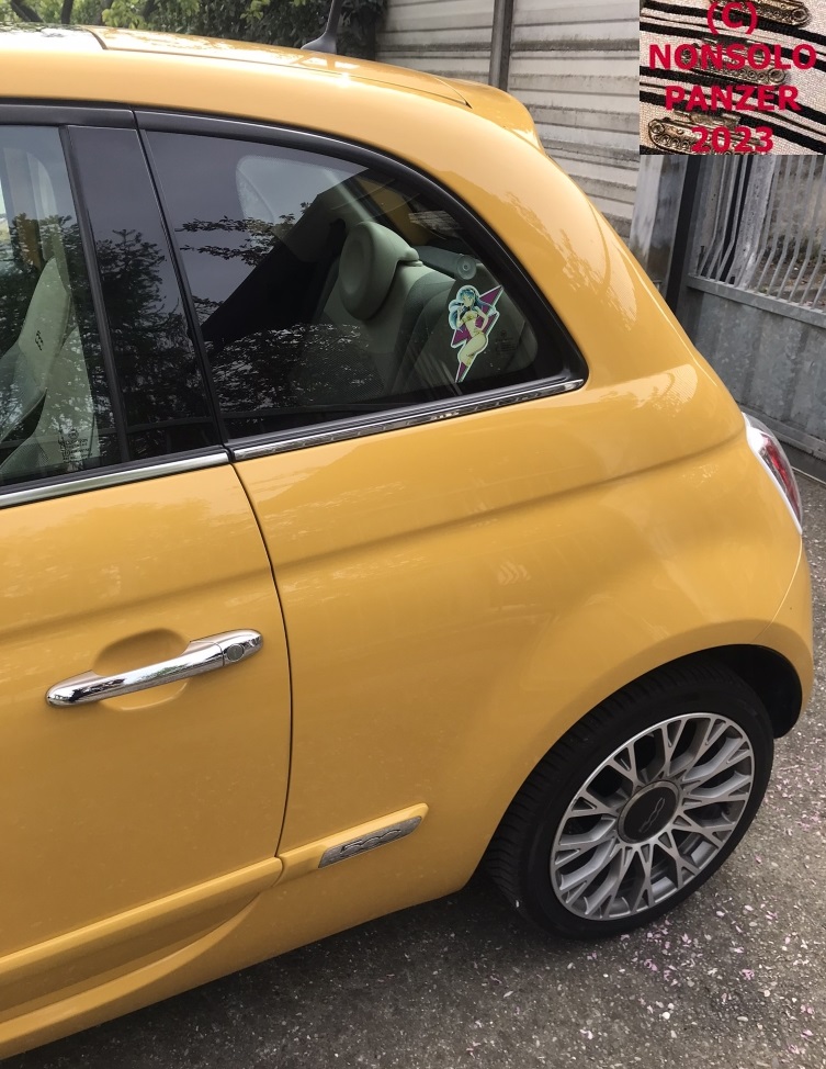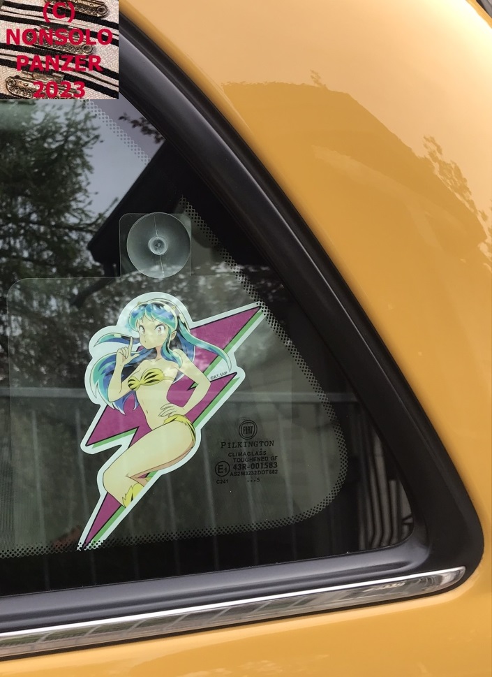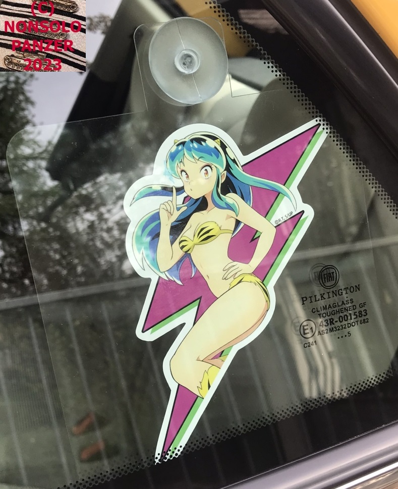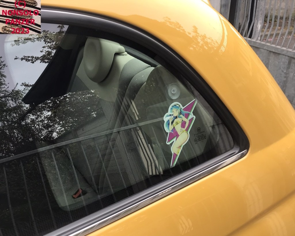Considering the colours involved and the appeal of the character represented, the idea of attaching this Urusei Yatsura Lum Sticker to the side window of my beautiful pastel sun-yellow Fiat 500 came up spontaneously.