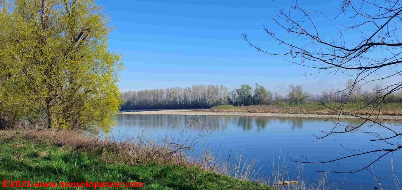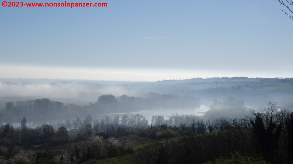 Parcheggiata l’auto poco lontano da Casale Monferrato, abbiamo inforcato le biciclette e costeggiato un breve tratto del Po. Molto suggestiva era la vista del grande fiume grazie alla luce mattutina e all’umidità che si sollevava dall’acqua nonostante la crisi idrica dovuta alla persistente siccità.