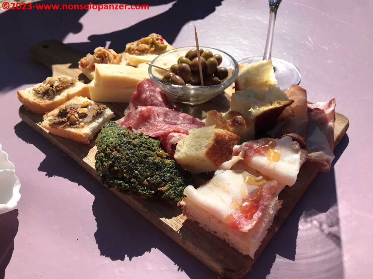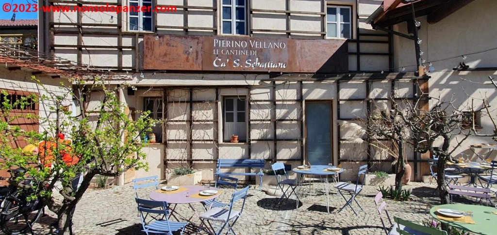 Leaving Pontestura, Roberto and I stopped at “Le Botti” Bistrot. The restaurant is located along the SP5, just opposite the intersection with the road that would shortly after lead us to Fabiano. The ideal time of day for an aperitif, the outdoor tables lit up by a pleasant sunshine and the feeling of being able to taste local delights were temptations against which we put up only a feeble resistance, which immediately collapsed at the sight of the slope that awaited us. It was worth it, the aperitif they prepared for us was excellent and certainly contributed to the appreciation of the whole day.