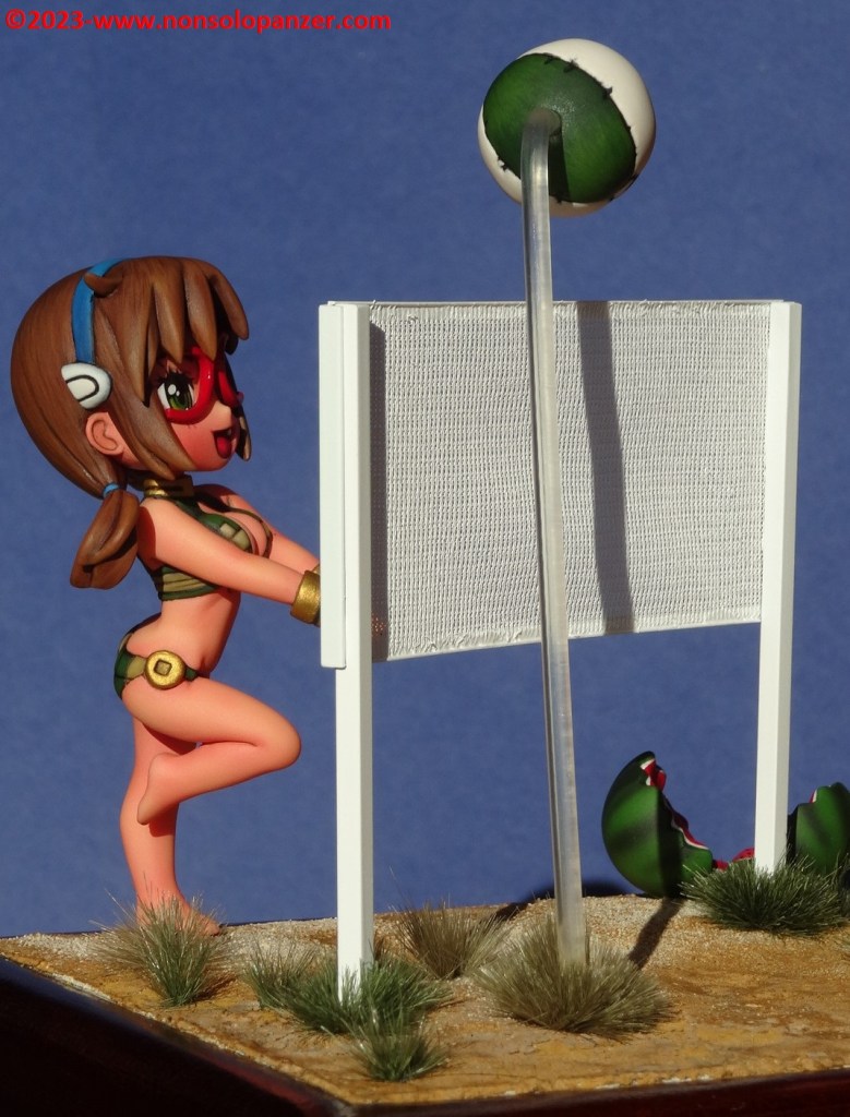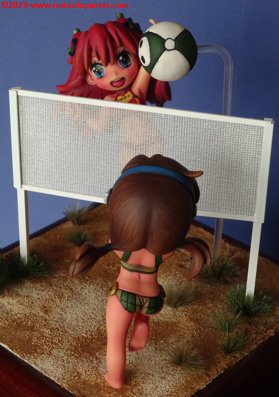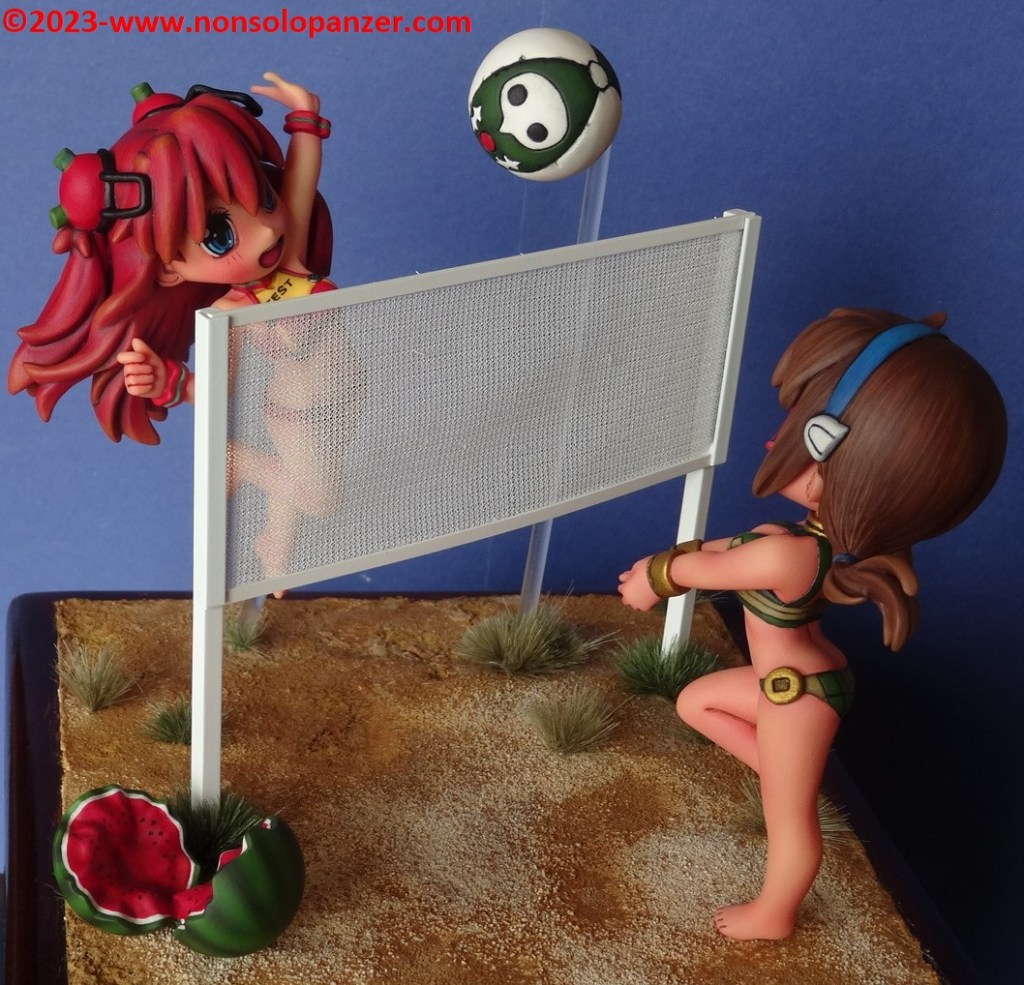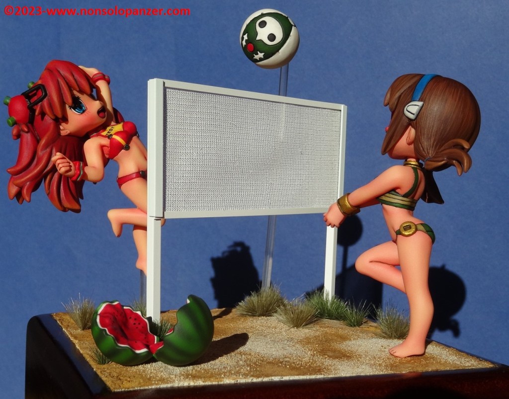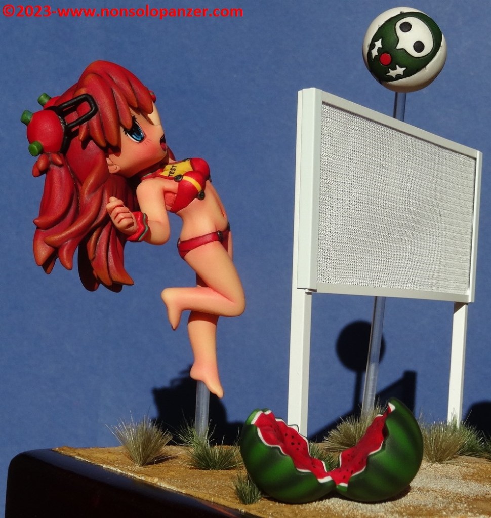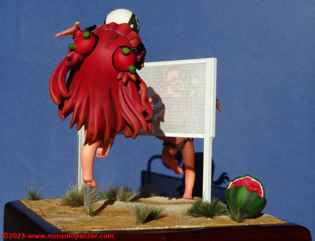 Una volta terminata la pittura di Asuka e Mari, ho realizzato il diorama rappresentante la partita di Beach Volley giocata dai due personaggi. Assemblato il basamento in legno, ho costruito la rete da Volley con dei listelli di ottone ed un vecchio retino per acquari. Grazie alla mia esperienza nel modellismo militare, ho riprodotto agevolmente il campo di sabbia ed i ciuffi di erba che lo costellano. Benché questi ultimi non siano comuni in un campo da Beach Volley, ho deciso di aggiungerli per rendere più attrattiva la scena. Ho usato i sostegni in plastica trasparente contenuti nei due set “C-style Petit Eva Summer! Swim Wear!“ per posizionare un volo la palla sopra la rete e per dare l’impressione che Asuka stia spiccando un salto. Infine, ho posizionato l’anguria come elemento decorativo.