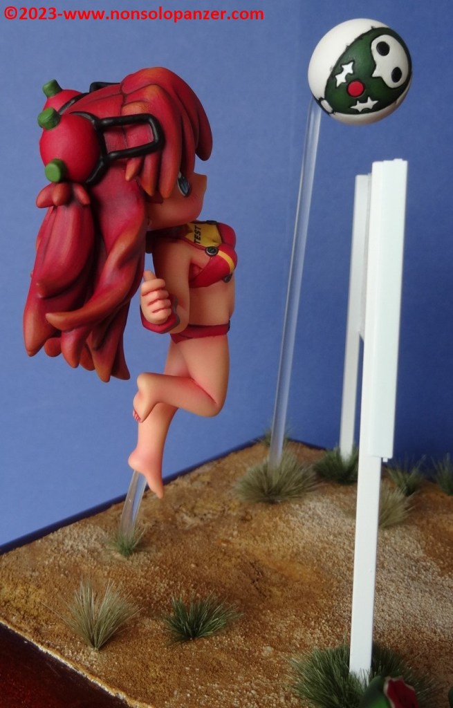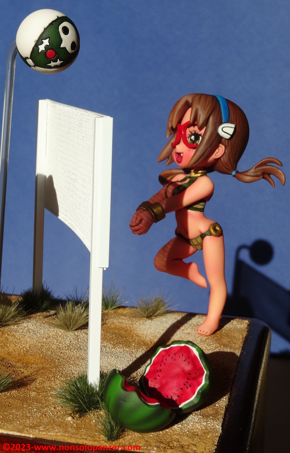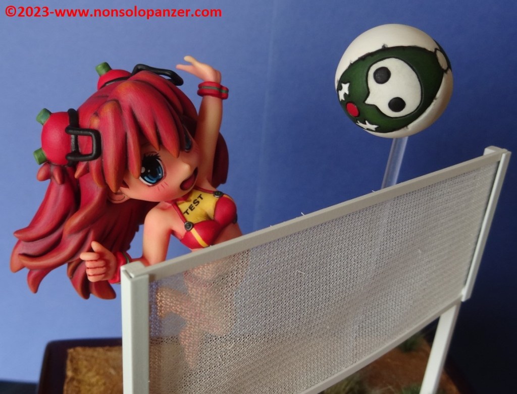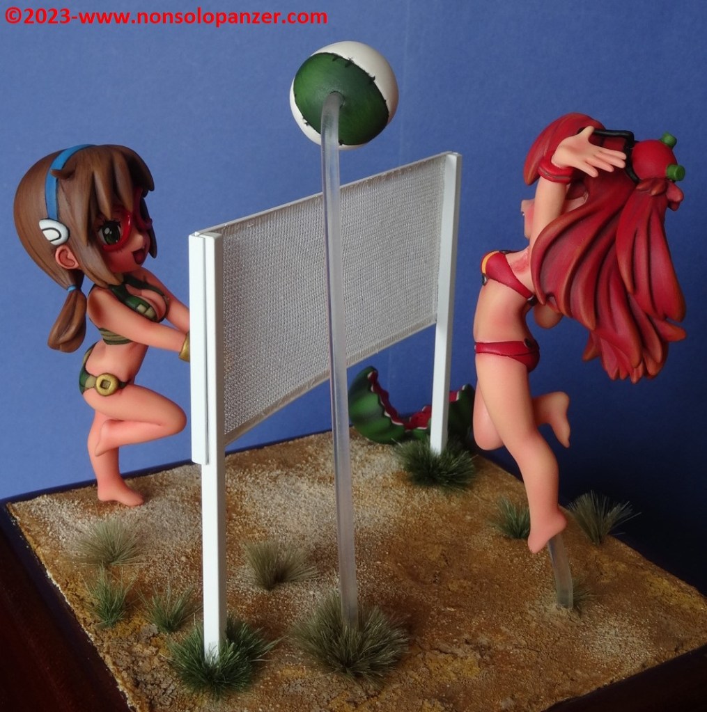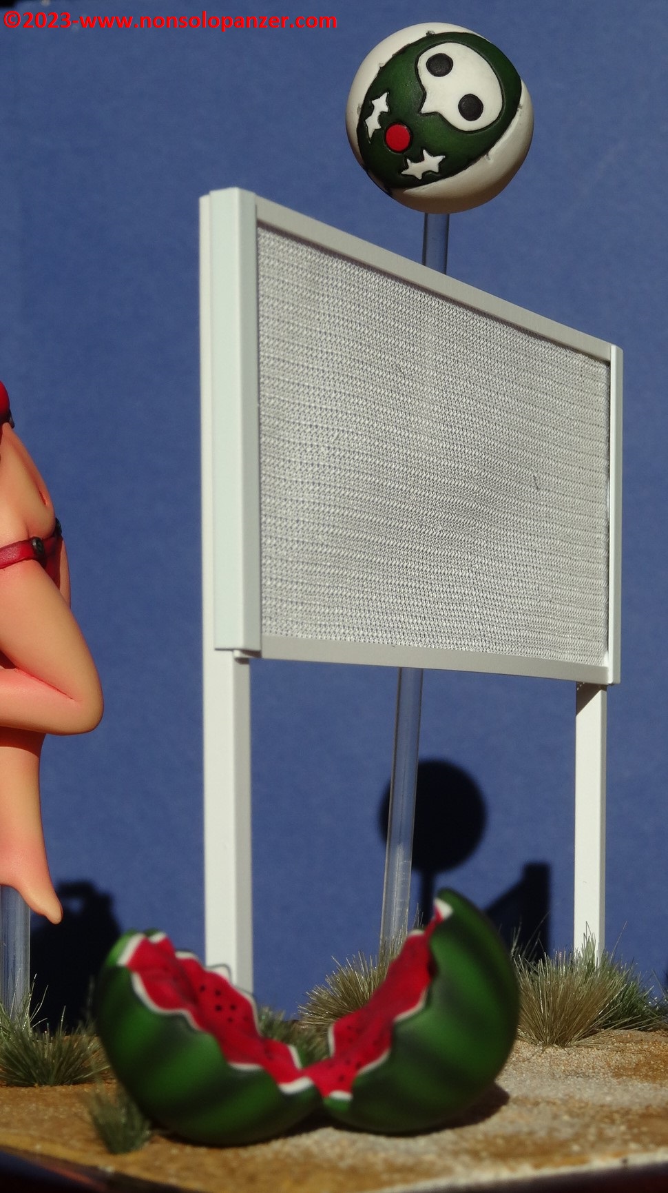 Una volta terminata la pittura di Asuka e Mari, ho realizzato il diorama rappresentante la partita di Beach Volley giocata dai due personaggi. Assemblato il basamento in legno, ho costruito la rete da Volley con dei listelli di ottone ed un vecchio retino per acquari. Grazie alla mia esperienza nel modellismo militare, ho riprodotto agevolmente il campo di sabbia ed i ciuffi di erba che lo costellano. Benché questi ultimi non siano comuni in un campo da Beach Volley, ho deciso di aggiungerli per rendere più attrattiva la scena. Ho usato i sostegni in plastica trasparente contenuti nei due set “C-style Petit Eva Summer! Swim Wear!“ per posizionare un volo la palla sopra la rete e per dare l’impressione che Asuka stia spiccando un salto. Infine, ho posizionato l’anguria come elemento decorativo.