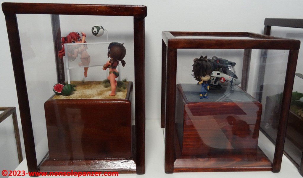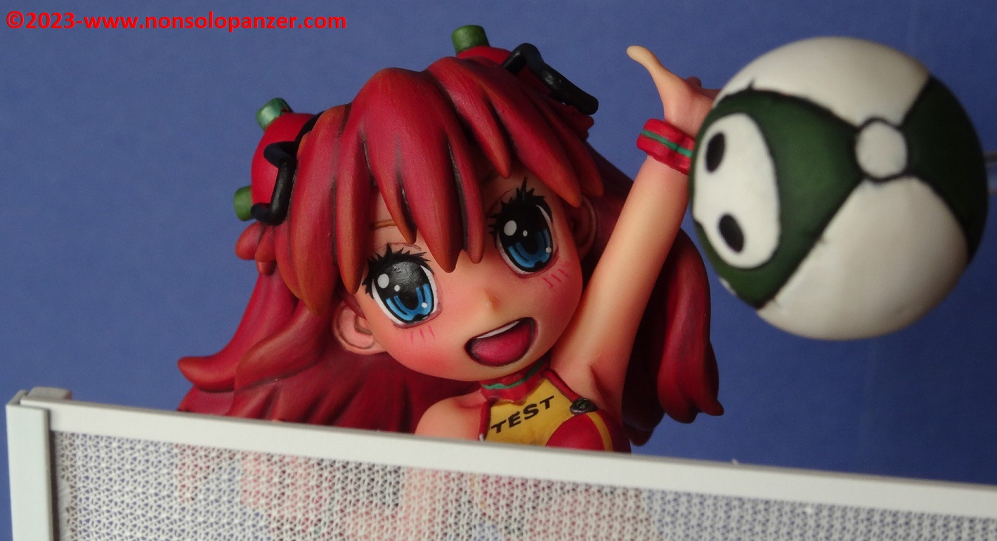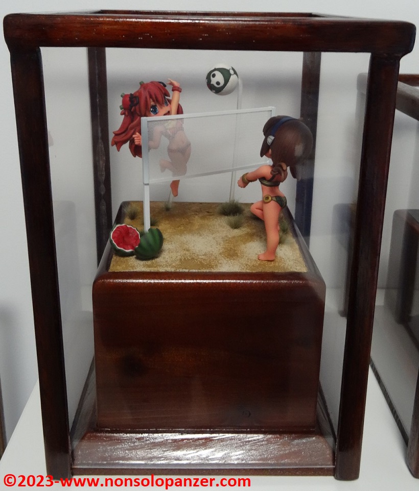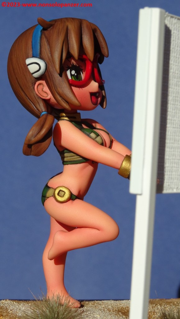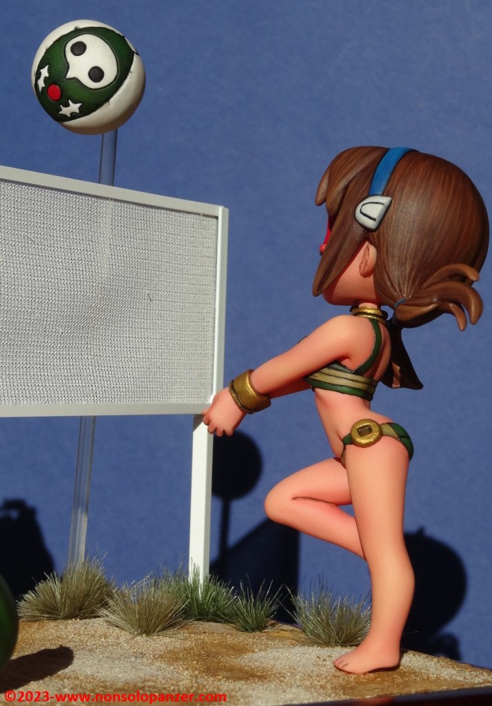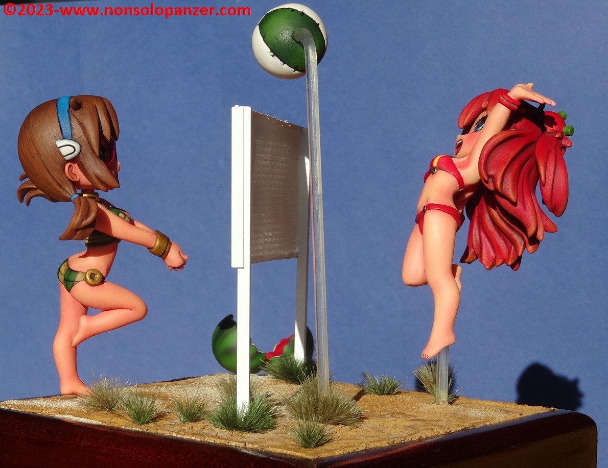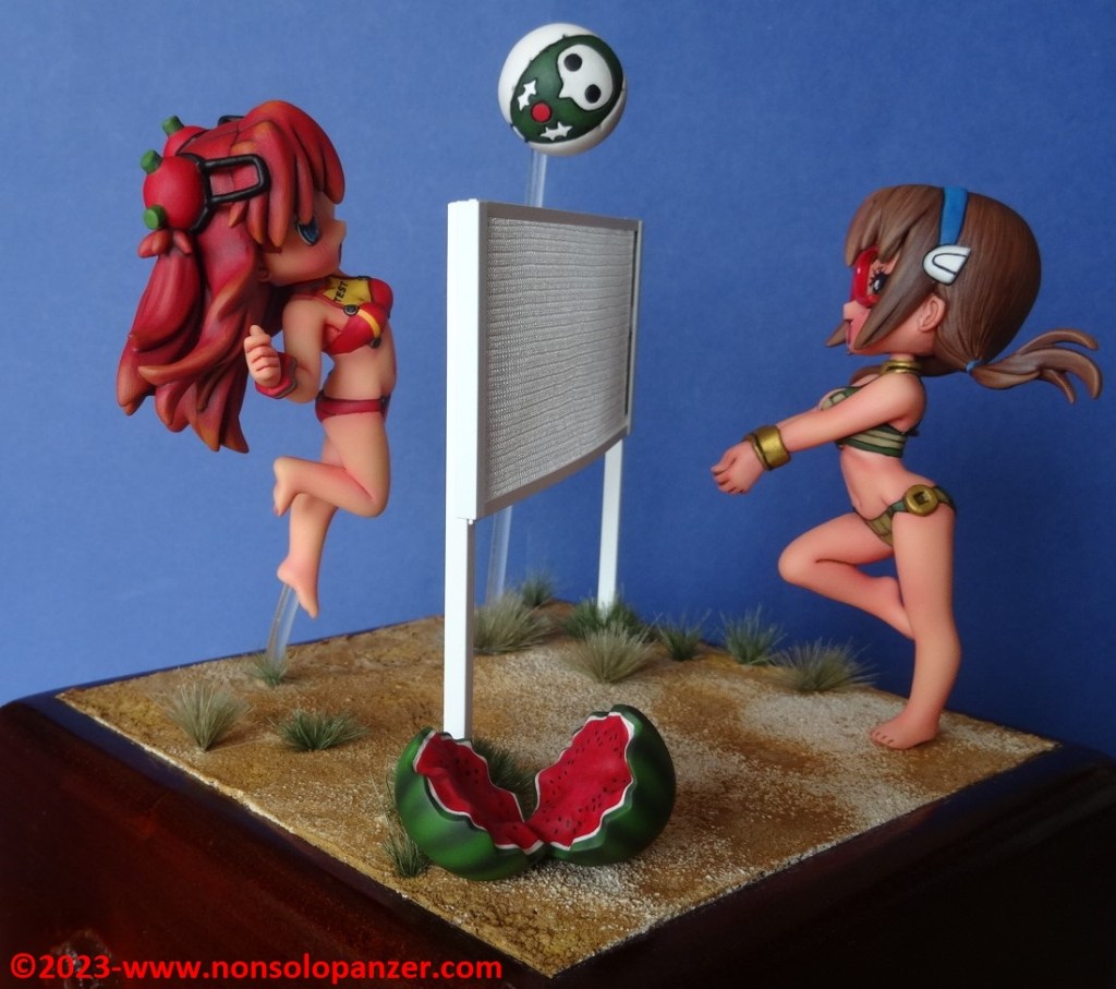 Una volta terminata la pittura di Asuka e Mari, ho realizzato il diorama rappresentante la partita di Beach Volley giocata dai due personaggi. Assemblato il basamento in legno, ho costruito la rete da Volley con dei listelli di ottone ed un vecchio retino per acquari. Grazie alla mia esperienza nel modellismo militare, ho riprodotto agevolmente il campo di sabbia ed i ciuffi di erba che lo costellano. Benché questi ultimi non siano comuni in un campo da Beach Volley, ho deciso di aggiungerli per rendere più attrattiva la scena. Ho usato i sostegni in plastica trasparente contenuti nei due set “C-style Petit Eva Summer! Swim Wear!“ per posizionare un volo la palla sopra la rete e per dare l’impressione che Asuka stia spiccando un salto. Infine, ho posizionato l’anguria come elemento decorativo.