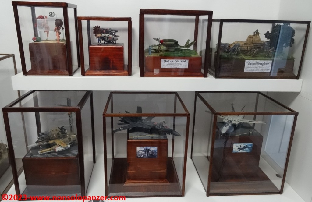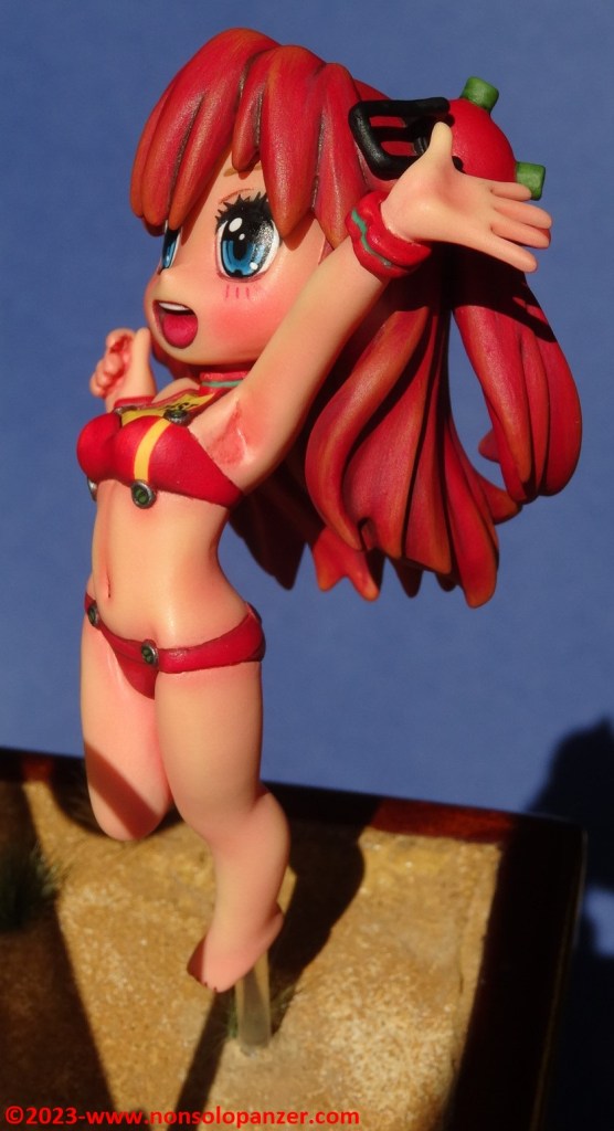Il risultato finale mi pare molto buono: il diorama è accattivante ed ogni singolo elemento che lo compone è ben dipinto e convincente. Anche da un punto di vista del coinvolgimento dell’osservatore, la scenetta risulta dinamica e simpaticamente appassionante. A mio parere, l’unico difetto era ravvisabile nella postura di Asuka che sembra sbilanciata all’indietro. La causa era nel foro che ho praticato nella gamba per l’inserimento del perno di supporto. Tale foro non compensava la schiena arcuata del personaggio che, insieme alla folta capigliatura, dava l’impressione di un movimento anormale.