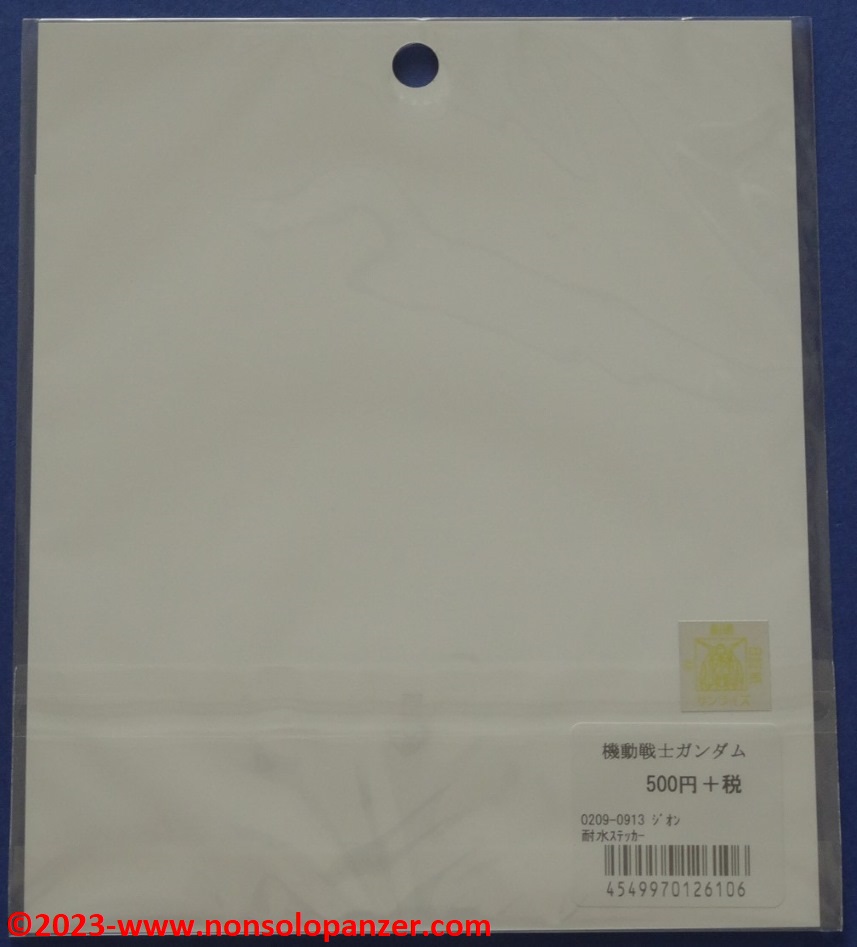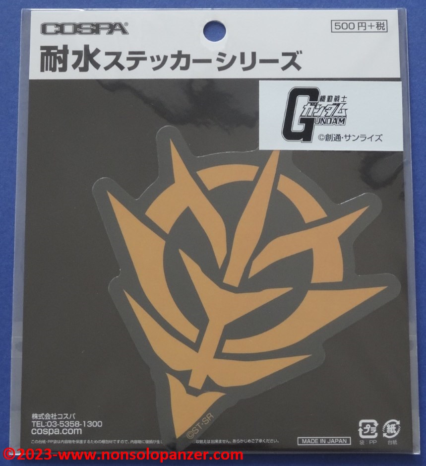 Commercializzato da Cospa, questo “Principality of Zeon” Waterproof Sticker è di ottima qualità, ben riprodotto, dai colori intensi e resistente all’acqua. Un gadget irrinunciabile per chiunque voglia dichiarare al mondo il proprio schieramento nella One Year War raccontata in “Mobile Suit Gundam”.