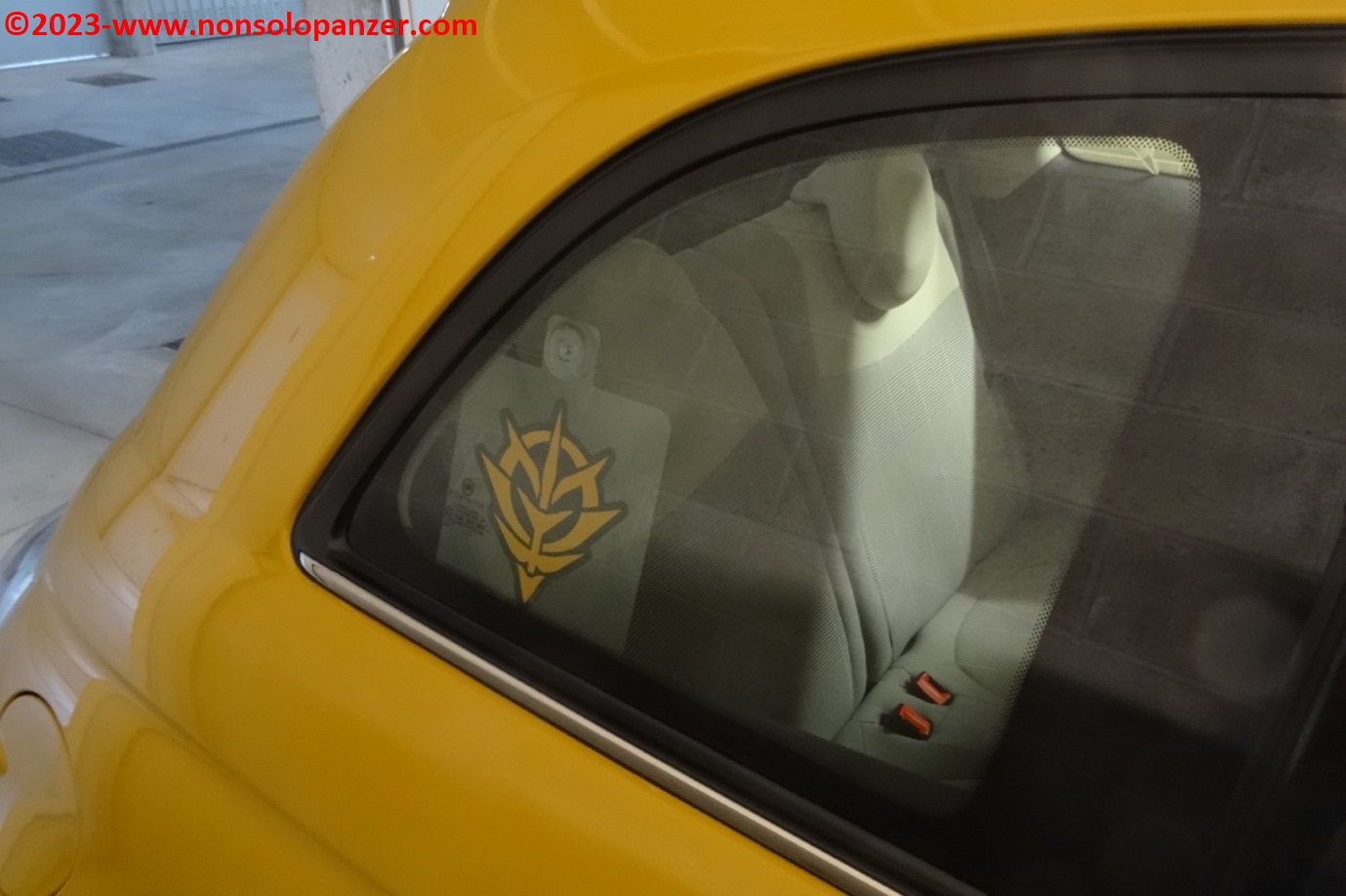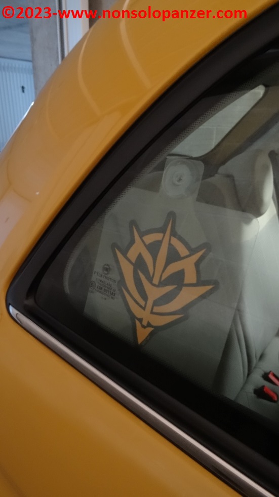 Thanks to the beautiful yellow color of the “Principality of Zeon” Waterproof Sticker, the idea of attaching it to the rear window of my beautiful pastel sunshine yellow Fiat 500, on the opposite side of the Urusei Yatsura Lum Sticker, arose spontaneously. I really like the combination created in this way.