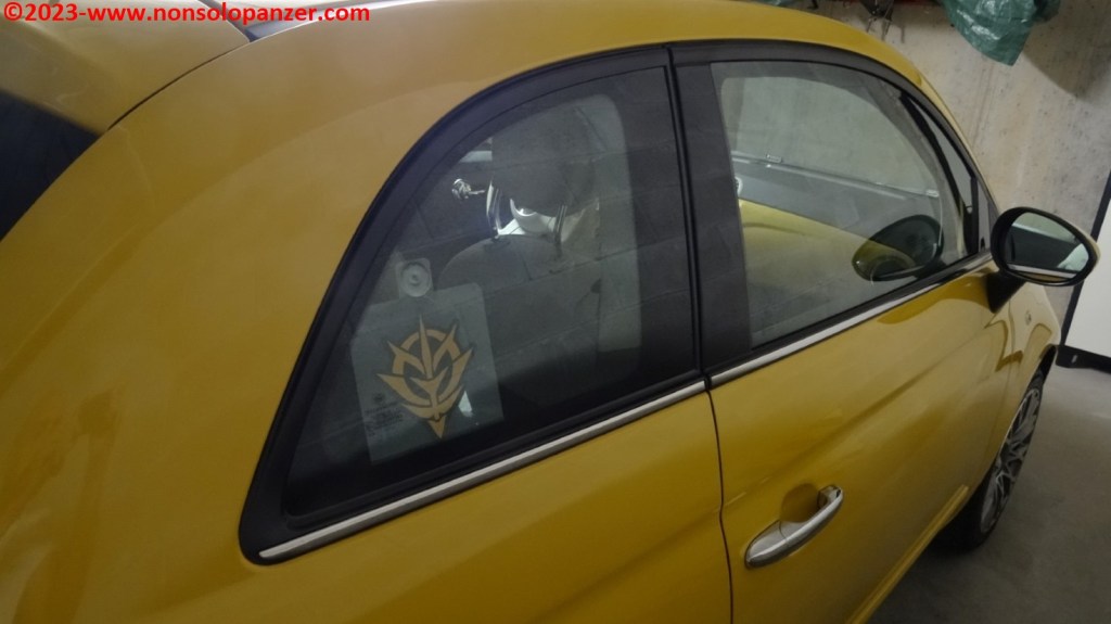 Grazie al bel giallo che contraddistingue il “Principality of Zeon” Waterproof Sticker, è sorta spontanea l’idea di attaccarlo al finestrino posteriore della mia bella Fiat 500 giallo sole pastello, sul lato opposto del Urusei Yatsura Lum Sticker. L’abbinamento così creato mi piace davvero tanto.