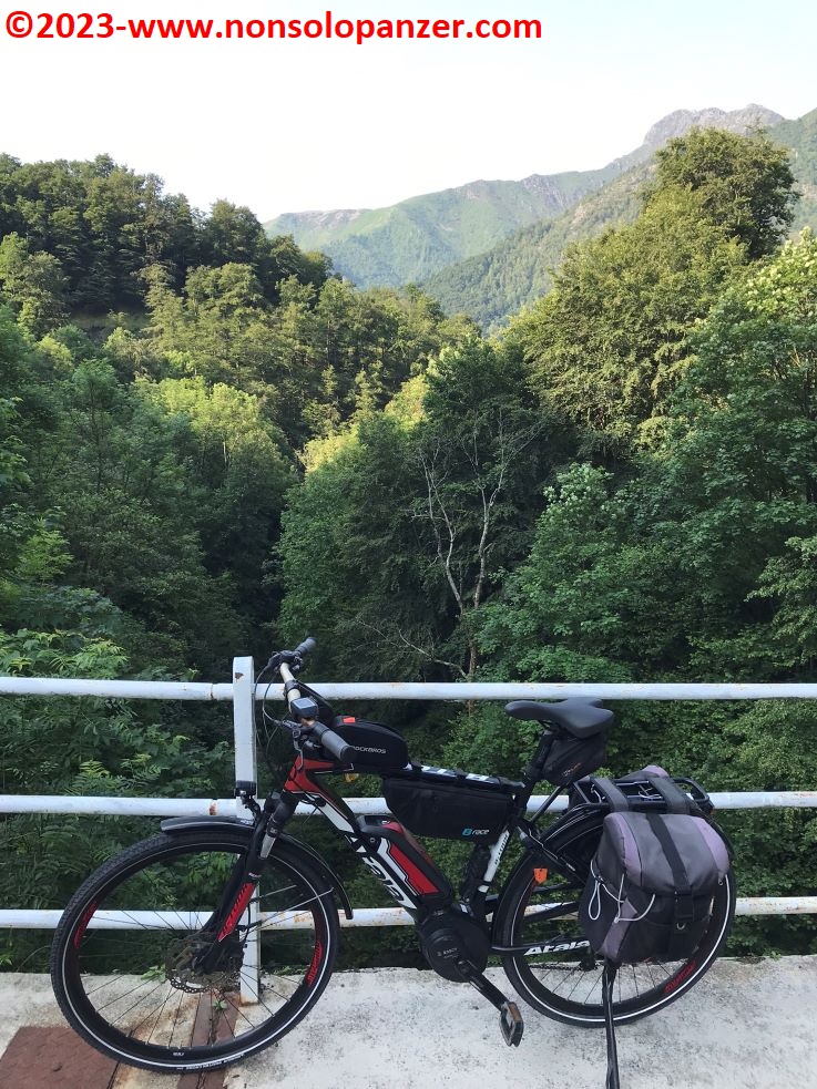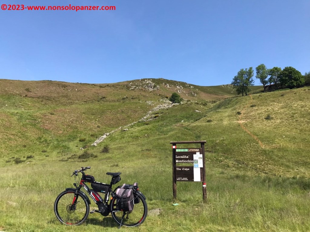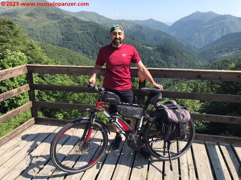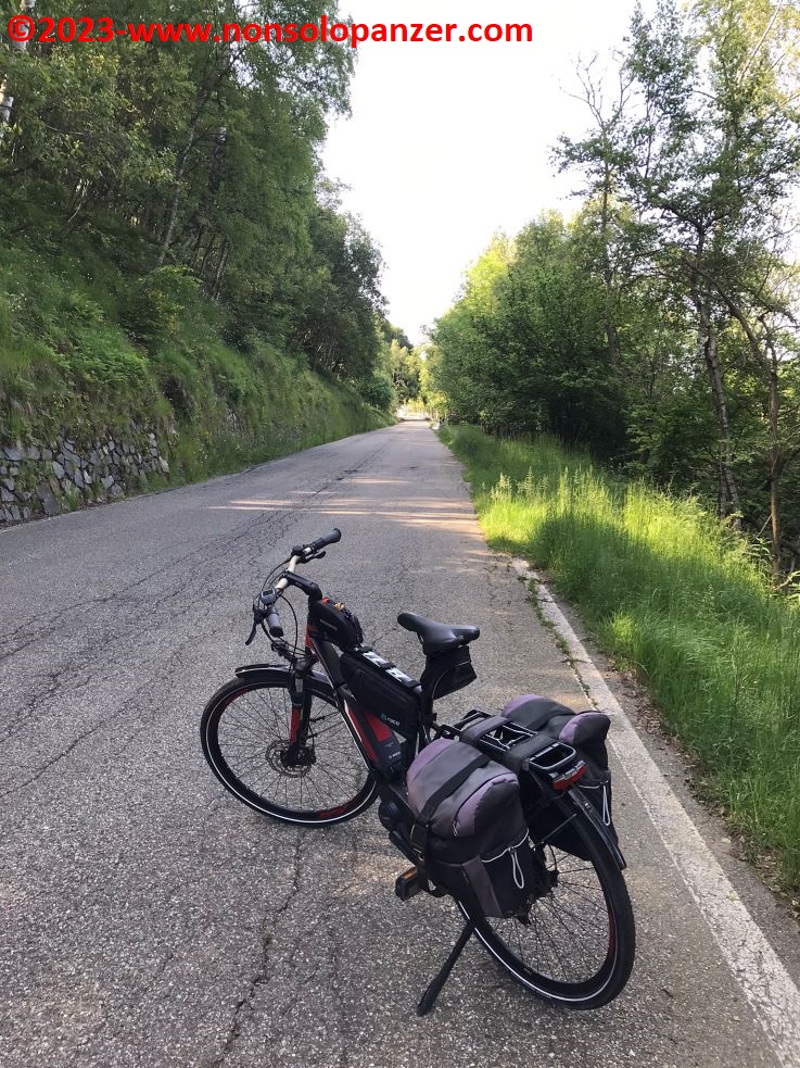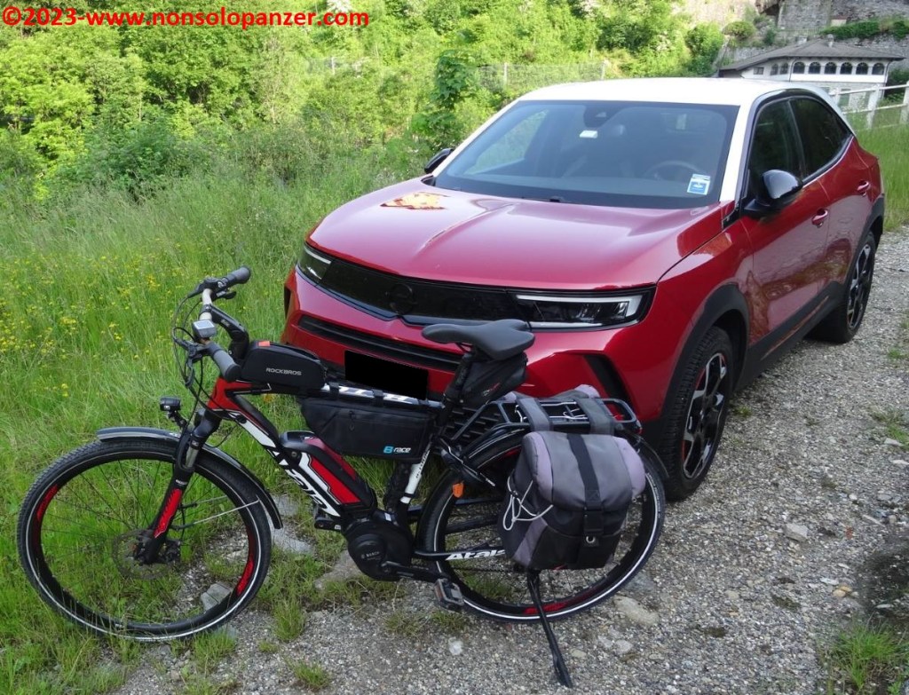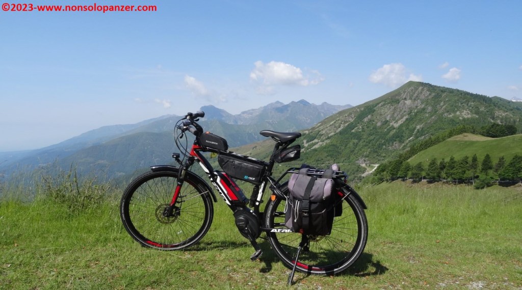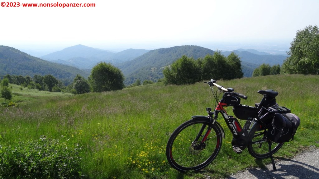 I could not resist the double temptation to discover the wonders of the “Panoramica Zegna” and to continue on the road that began at the Sanctuary of Oropa. So, on 17 June 2023, I left home early in the morning with the beautiful Opel “Mokka” equipped with bike rack and pedal-assisted Atala. Arriving at a square just below Rosazza, I unloaded my bike and took Provincial Road 115, which would take me to Trivero, the town at the other end of the “Panoramica Zegna”.