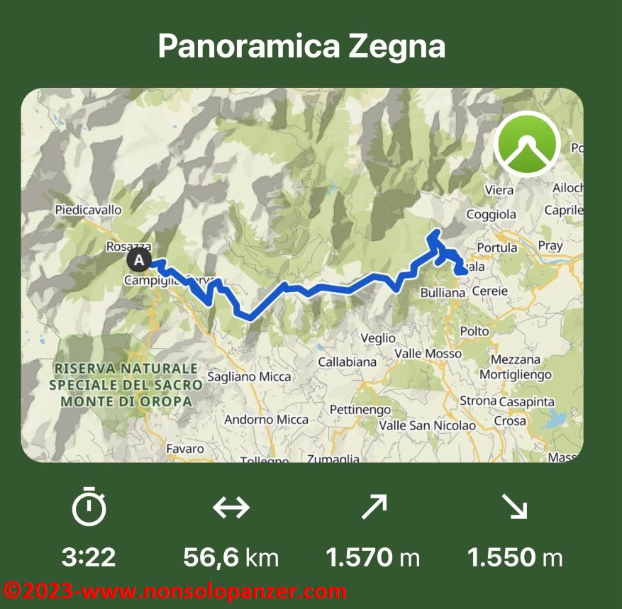 La “Panoramica Zegna” non si chiama così per caso. Si tratta di una bellissima strada che sale in cresta ai monti che fungono da spartiacque con la pianura sottostante. Il panorama di cui si gode è mozzafiato, spaziando dalle cime più alte delle Alpi, Monte Rosa compreso, alle Alpi Liguri appena visibili oltre la vastità della Pianura Padana. Il tutto è arricchito dalle località che si attraversano, come Piaro, Bocchetto Sassera e Bielmonte.