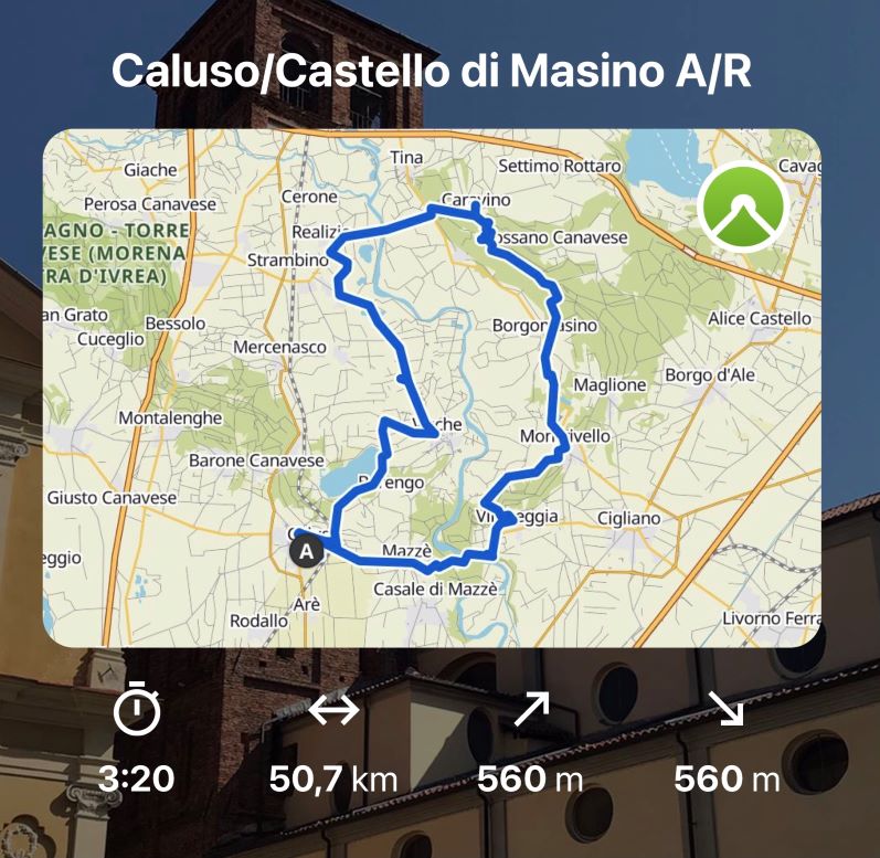 Usciti da Caluso, abbiamo percorso i 25 chilometri che ci separavano dal Castello di Masino. Abbiamo costeggiato il Lago di Candia, siamo passati per Vische e Crotte e siamo arrivati a Caravino attraversando un ponte sul fiume Dora Baltea da cui si godeva una bella vista sul castello e la campagna circostante.