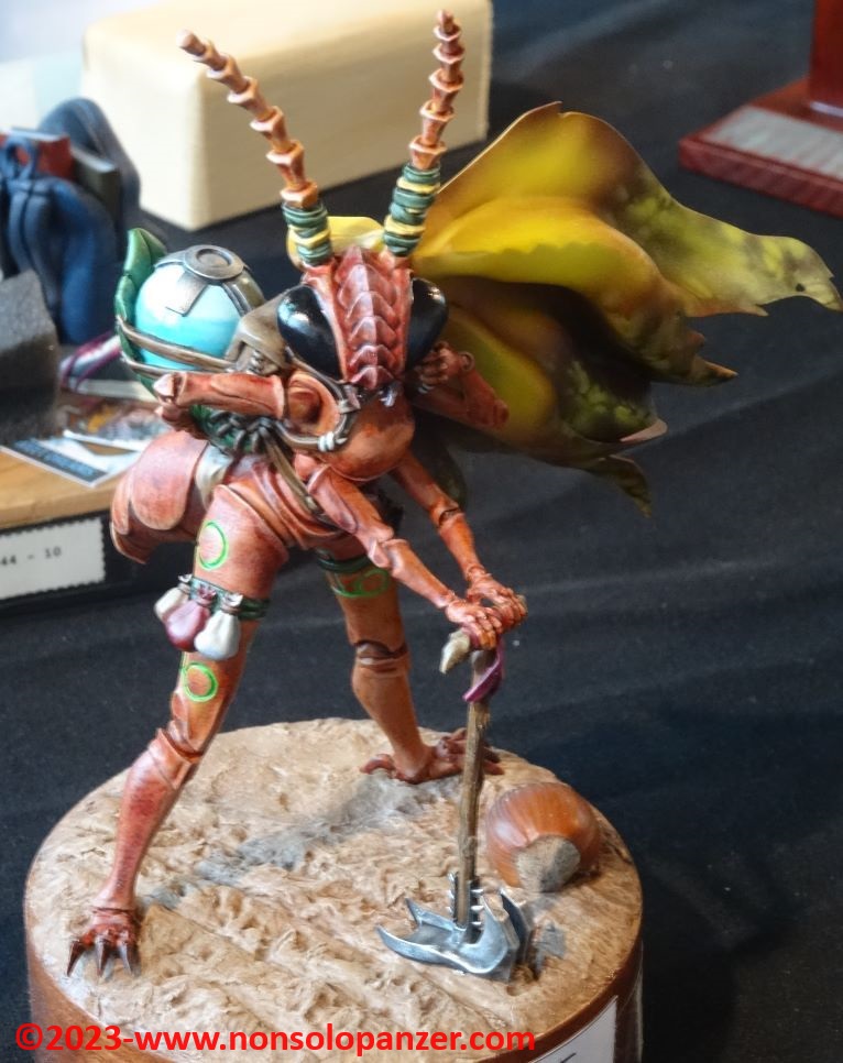 At the award ceremony, I received a very unexpected prize. “Abdel Rashid“, the bust of a lion man dressed as a Tuareg, was appreciated by Suzume Shun, a very talented girl who designs and prints her own fantasy characters. While strolling through the trade fair’s commercial area, I had taken a long break at Suzume’s stan appreciating in particular the “Working Ant” miniature. You can well imagine my surprise when I found out that Suzume had decided to award my bust with that work. Therefore, I would like to thank Suzume here too, wishing me to live up to the pictorial expectations he places on me.