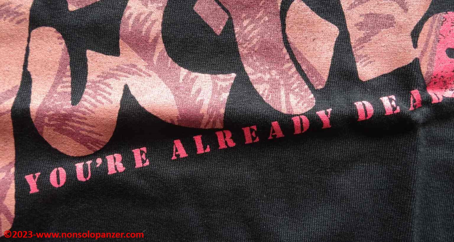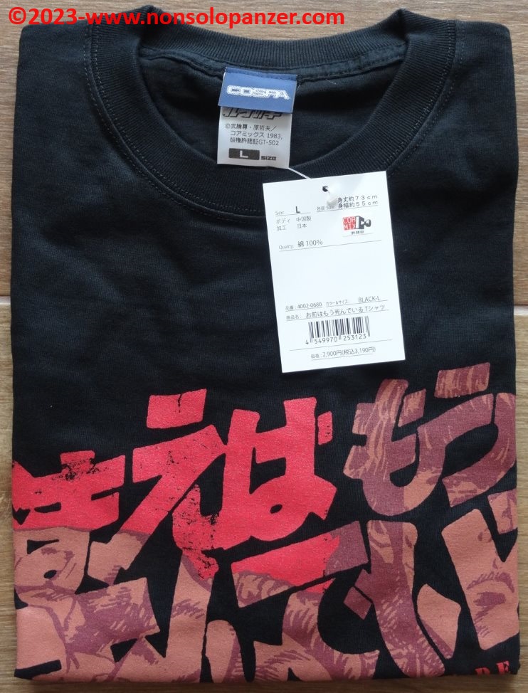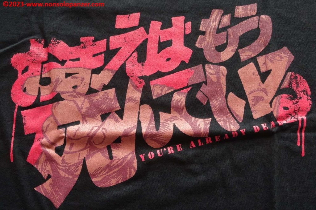 All that remains is to resign oneself… time passes inexorably and with it, year after year, the anniversaries of old glories that have cheered the childhood of almost fifty year olds like me add up. After “Nadia, The Secret of Blue Water“, “Urusei Yatsura“, “Macross” (just to name a few), another cult work turns forty: “Hokuto no Ken“,known in Italy as “Ken the Warrior“. Written by Buronson and drawn by Tetsuo Hara, the “Hokuto no Ken” manga was published in Japan from 1983 to 1988 and was transposed into two animated series aired from 1984 to 1988. These soon reached Italian televisions, decreeing the 1980s as an unrepeatable era for Japanese animation. Today, streaming and TV on demand offer a quantity of anime beyond the most extreme fantasies of any fan, but the broadcasting on Italian generalist TV of a work like “Ken the Warrior” is simply impossible. Free-to-air channels abound, but the level of the animated series broadcast is too banal and standardized in content to tolerate a product like “Ken the Warrior”, a visually violent work, full of those emotional and thematic excesses that were typical of the 1980s. I don’t think Japan is in the same situation, but in a world that takes refuge in nostalgia to escape the ugliness of contemporary reality, even Japanese entertainment is taking advantage of the 40th anniversary of “Hokuto no Ken” to delight fans and lighten their wallets with products such as this “You’re Dead” T-shirt, which, of course, I couldn’t resist buying.