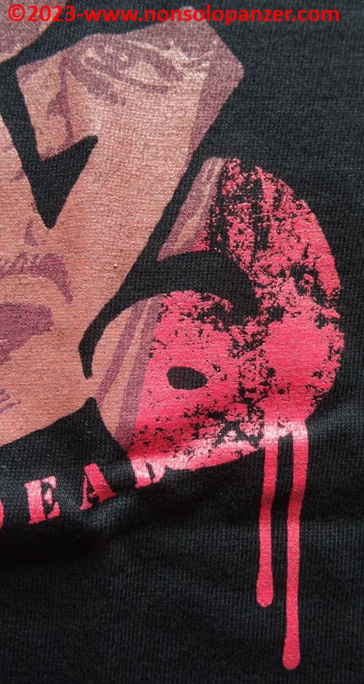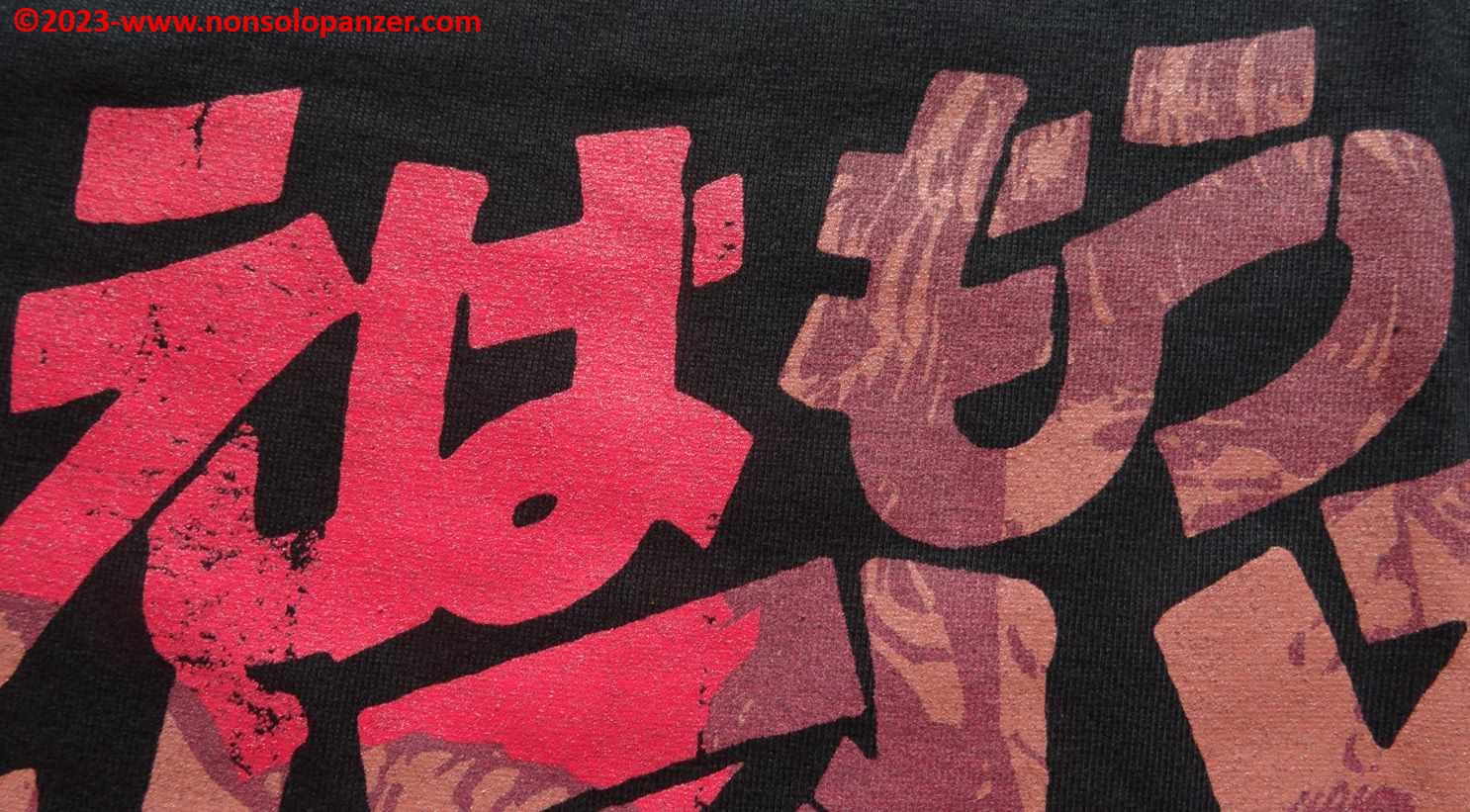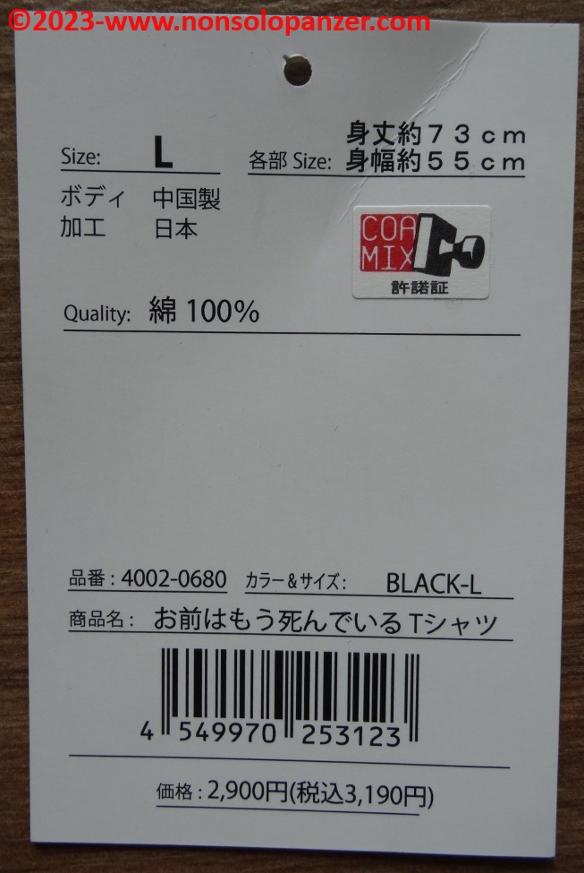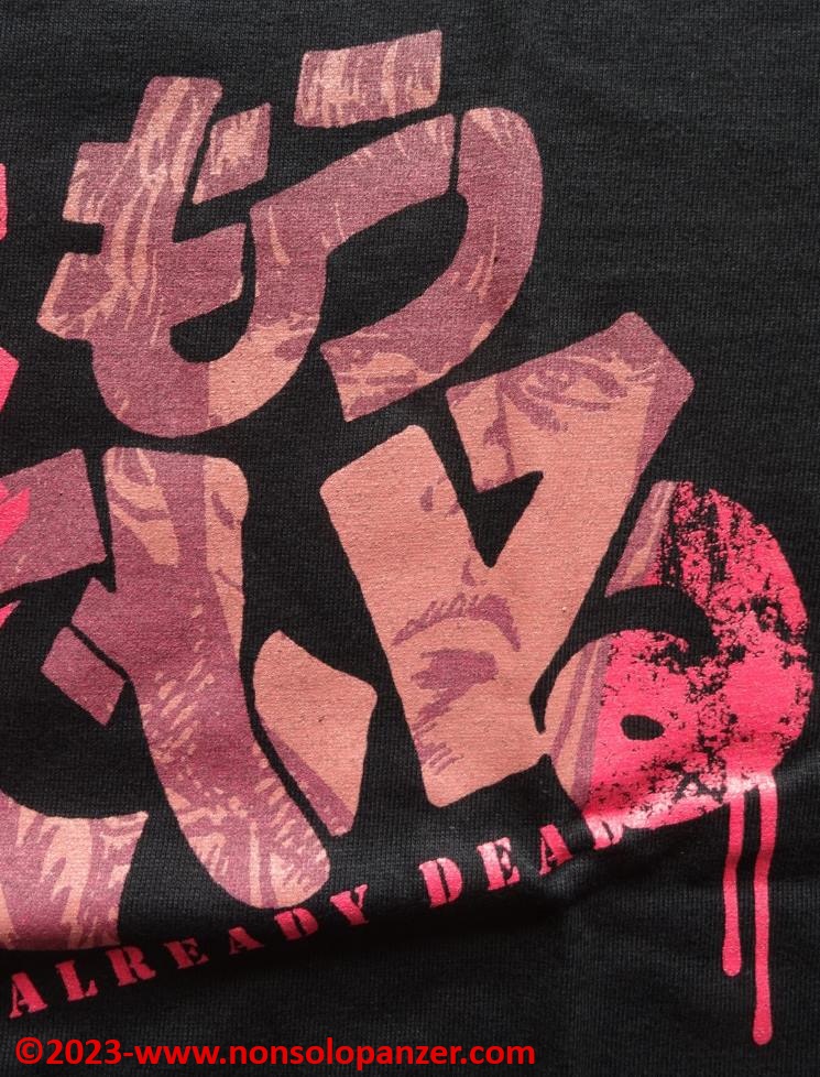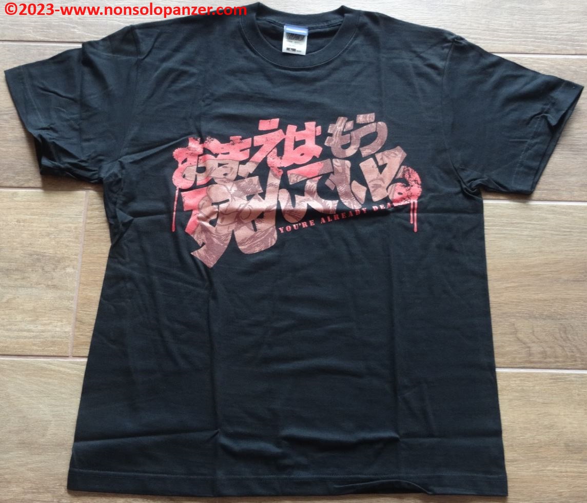 Come spesso avviene, anche questa fantastica maglietta è prodotta e commercializzata in Giappone da Cospa. La scritta riprodotta in meravigliosi e suggestivi Hiragana e Kanji significa “Sei già morto”, famosa frase che Kenshiro, protagonista di “Hokuto no Ken”, non manca di recitare ogni volta in cui preme gli Tsubo dei suoi malcapitati avversari. La grafica non manca di simulare del sangue che cola dalla scritta ed un occhio attento coglierà il volto di Kenshiro comporsi come un mosaico dall’accostamento degli ideogrammi.
