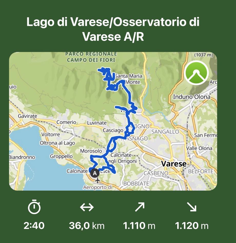 The route proved to be very impressive. I passed through villages spotted with beautiful villas, often served by a network of funiculars and tramways now disused but whose vestiges demonstrate the rich tourism that the Varese area enjoyed at the beginning of the 20th century. The Grand Hotel Campo dei Fiori itself is a sad witness to the Italian Art Nouveau style of the time and the inexorable decline of the many entrepreneurial energies lost with the two world wars. If this were not enough, once you enter the regional park, the road crosses dense woods whose trees, thinning out here and there, offer breathtaking views that culminate on the top of the astronomical observatory from which the view sweeps from the Po Valley to the Swiss Alps.