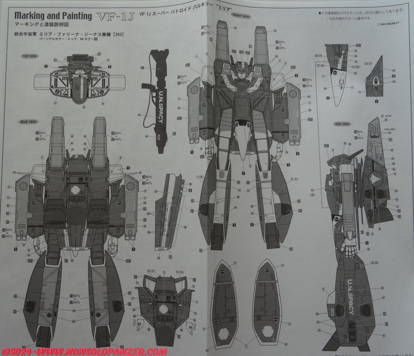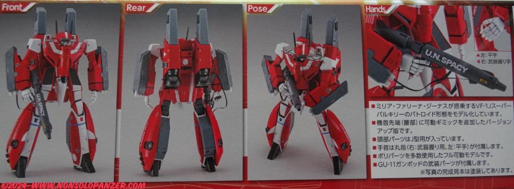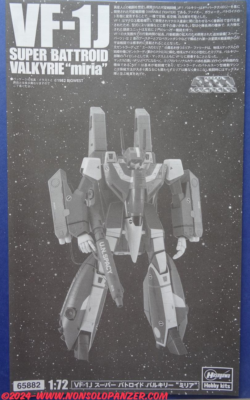 Il kit in scala 1/72 oggetto di questo articolo rappresenta il VF-1J di Miria nella configurazione Super Battroid. Il VF-1 è un caccia a configurazione variabile sviluppato dai terrestri utilizzando la tecnologia aliena recuperata dall’astronave extraterrestre precipitata sulla Terra. La configurazione Battroid è la trasformazione del caccia in un robot antropomorfo, mentre la versione “J” identifica il modello assegnato agli ufficiali. Il tipo “Super” è specificamente progettato per il combattimento nello spazio, dotato di booster aggiuntivi e armamenti potenziati.
