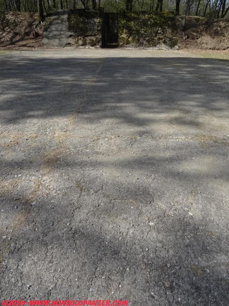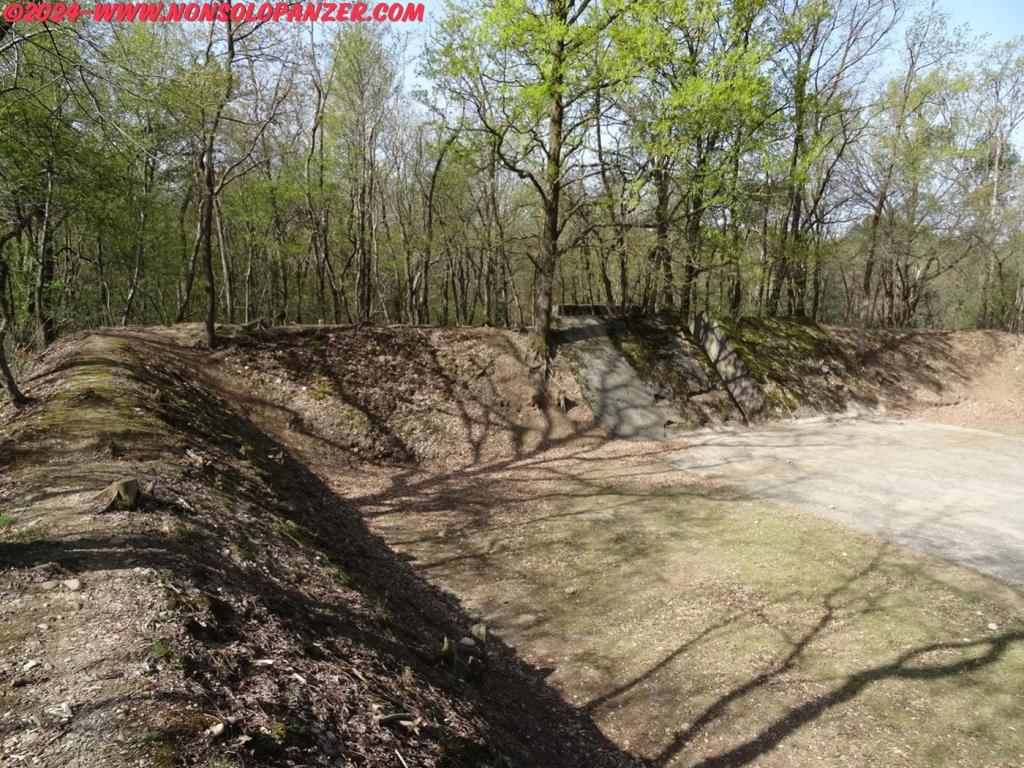A particularly well-preserved pitch impresses with its size and the imposing anti-fragment trench. At the bottom of the latter, a complex concrete structure seems to have been designed to break the airflow generated by the propellers, limiting the raising of dust.
