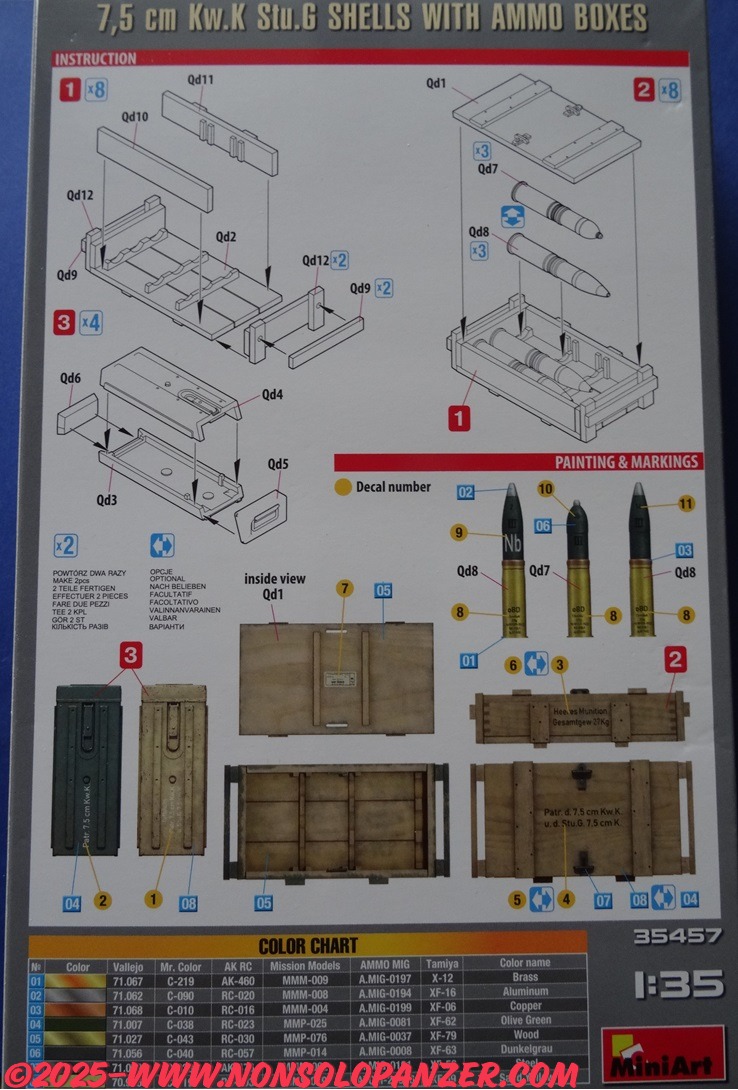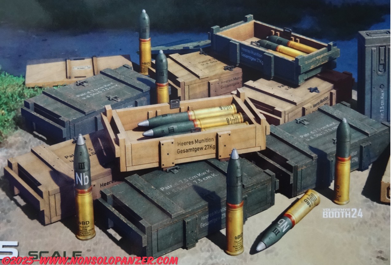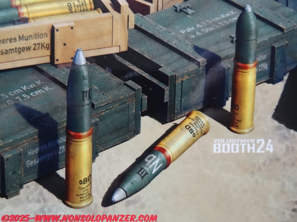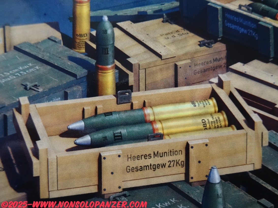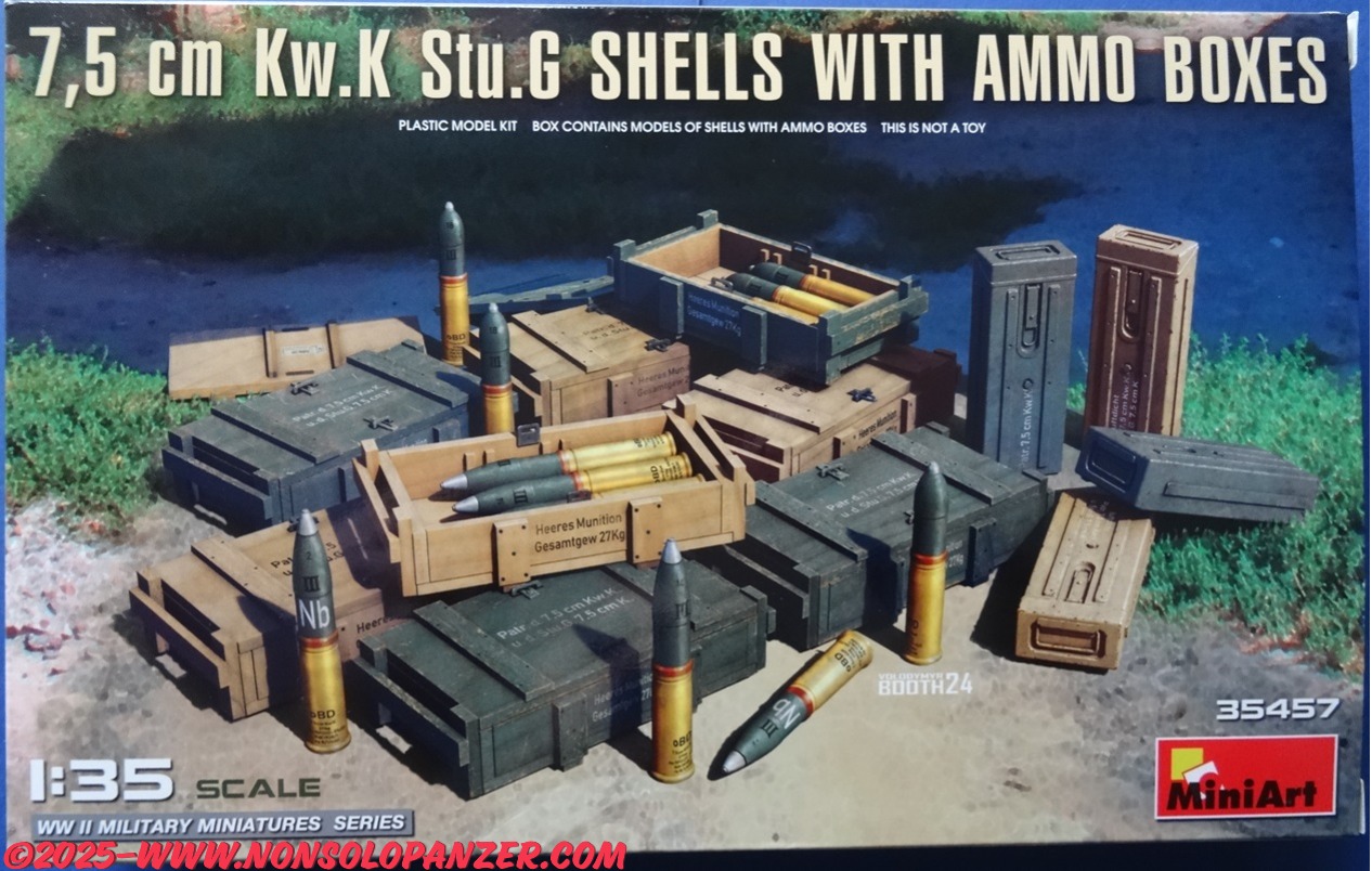 MiniArt ha recente commercializzato il kit in oggetto dedicato proprio ai proiettili del 7.5 cm KwK 37 L/24. Benché la confezione citi esclusivamente il cannone d’assalto StuG, i proiettili sono gli stessi utilizzati da tutti i veicoli che furono equipaggiati col 7.5 cm KwK 37 L/24. Si tratta, quindi, di un set assai utile a tutti gli appassionati di modellismo militare in scala 1/35 che vogliano arricchire i modelli che riproducono i numerosi veicoli che utilizzarono questo cannone. Il contenuto del kit, infine, è ben dettagliato e stampato, include sia i proiettili che le casse di trasporto nonché le decal per riprodurre le scritte tecniche.