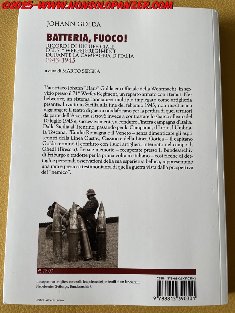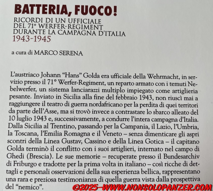 In the panorama of war memoirs published in Italy, “Battery, fire! – Memories of an officer of the 71st Werfer-Regiment during the Italian campaign 1943-1945” (Batteria, fuoco! – Ricordi di un ufficiale del 71° Werfer-Regiment durante la campagna d’Italia 1943-1945) by Johann Golda represents an interesting case since it is a testimony devoid of any novelistic adaptation and involving an ordinary German officer. The historiographical value is limited but the perspective offered is noteworthy: that of a lieutenant of the Wehrmacht of the 71st Werfer-Regiment, during the Italian Campaign.