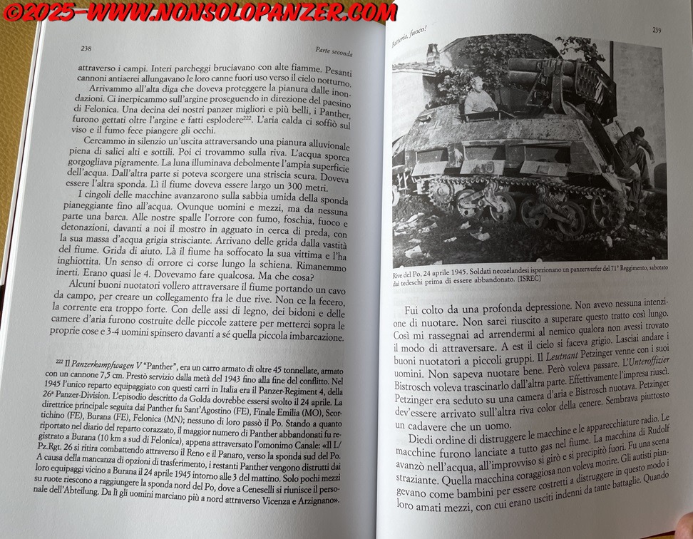 Among the advantages of this type of text there is certainly the authenticity of a direct, vivid and personal testimony of the experiences gained by the protagonist. The reader enters the daily life of a German officer at the front, perceives the strong friendship between the soldiers, the tragedy for the dead and wounded comrades, the sense of duty of Golda, who always tries to protect her men. The most negative aspect is that everything takes place in a very small context, conditioned by a repetitive everyday life and an extremely reduced view of the facts and the military context. The military activities of the battery are mentioned sporadically and very vaguely, indirectly confirming how the units carried out orders without knowing who they were shooting at and with what effects on the target or on the course of a battle. The book, it is worth remembering, is after all a personal diary and not the set of reports and the state of service of the 71st Werfer-Regiment. The consequences of all this determine, in my opinion, the main flaw of the book which, in practice, is reduced to the repetitive story of what most impacts, positively and negatively, on Golda’s daily life: the movements from one shooting position to another with the risks that entail, the setting up of protected positions for men and vehicles, the availability of food and alcohol, the organization of parties and jokes between soldiers and officers. The result is a monotonous text, always at the risk of being boring even to an inveterate military history enthusiast. Only in the final stages of the war, in particular in the crossing of the Panaro and the Po rivers, are there narrative flashes (the moment in which the unit is forced to destroy vehicles and Nebelwerfers is really touching – Golda is also deeply shocked by the extent of the German disaster on the great river and does not fail to witness with anger and discouragement the sad destruction of the last 10 “Panther” tanks of the Panzer-Regiment 26).