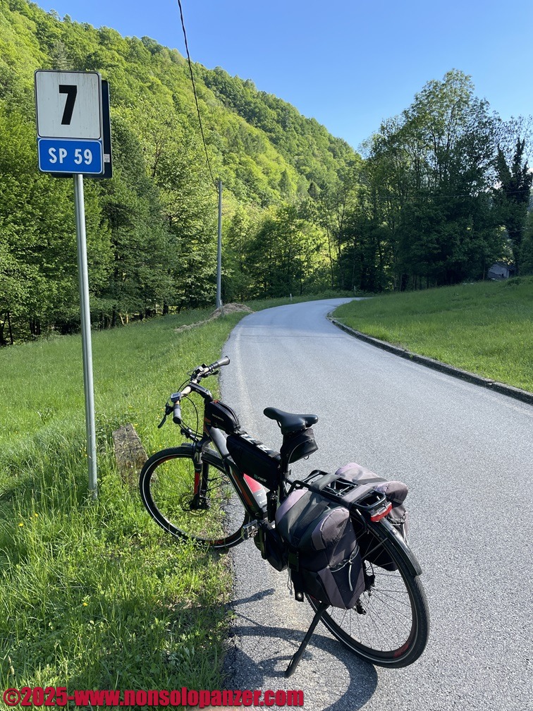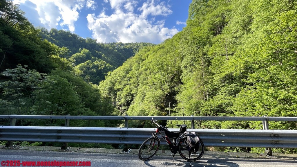 Around three in the afternoon, with my heart still in my throat and a smile on my face, I got back on the saddle for the last descent to Cambiasca. A pleasant stretch that, despite the important slopes, allowed me to savor every curve and every ray of sunshine filtered through the trees.