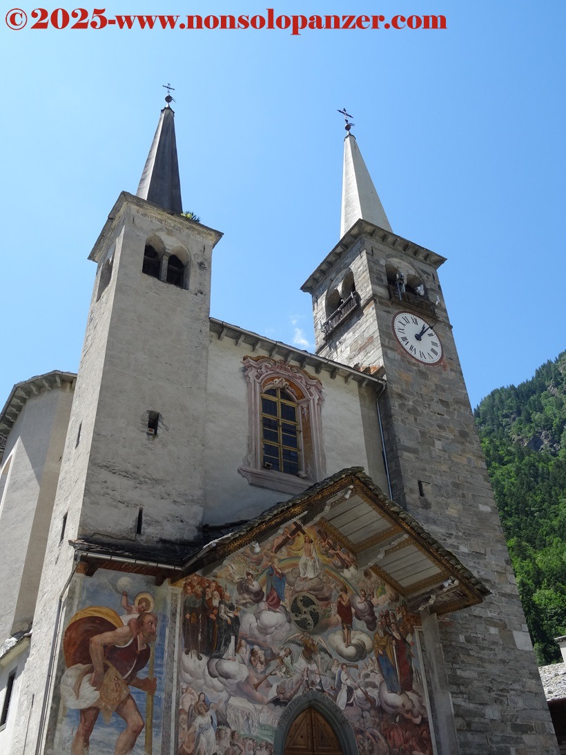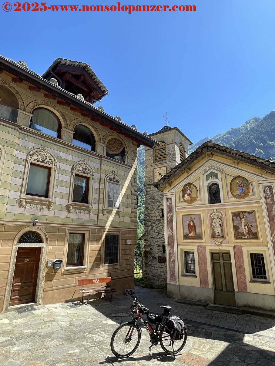 Da Scopetta in poi, il percorso diventa effettivamente ciclabile e serpeggia piacevolmente da un lato all’altro del fiume, attraversando borghi che sembrano usciti da un libro di fiabe. Qui la cultura Walser è ovunque: questo popolo di origine germanica si stabilì in Val Sesia nel XIII secolo, portando con sé tradizioni architettoniche e artistiche uniche. Le case Walser, in legno e pietra, sono spesso affrescate con motivi religiosi e floreali come dimostrano, in particolare, la piazza di Rusa e, soprattutto, la chiesa di San Cristoforo a Riva Valdobbia, dove sono rimasto incantato dal magnifico affresco del “Giudizio Universale”: un’opera che da sola vale il viaggio.